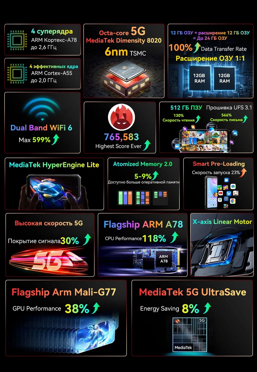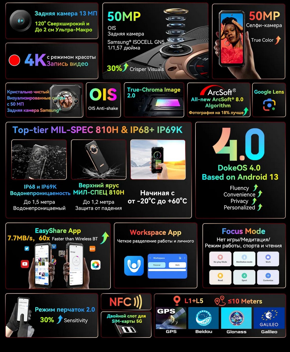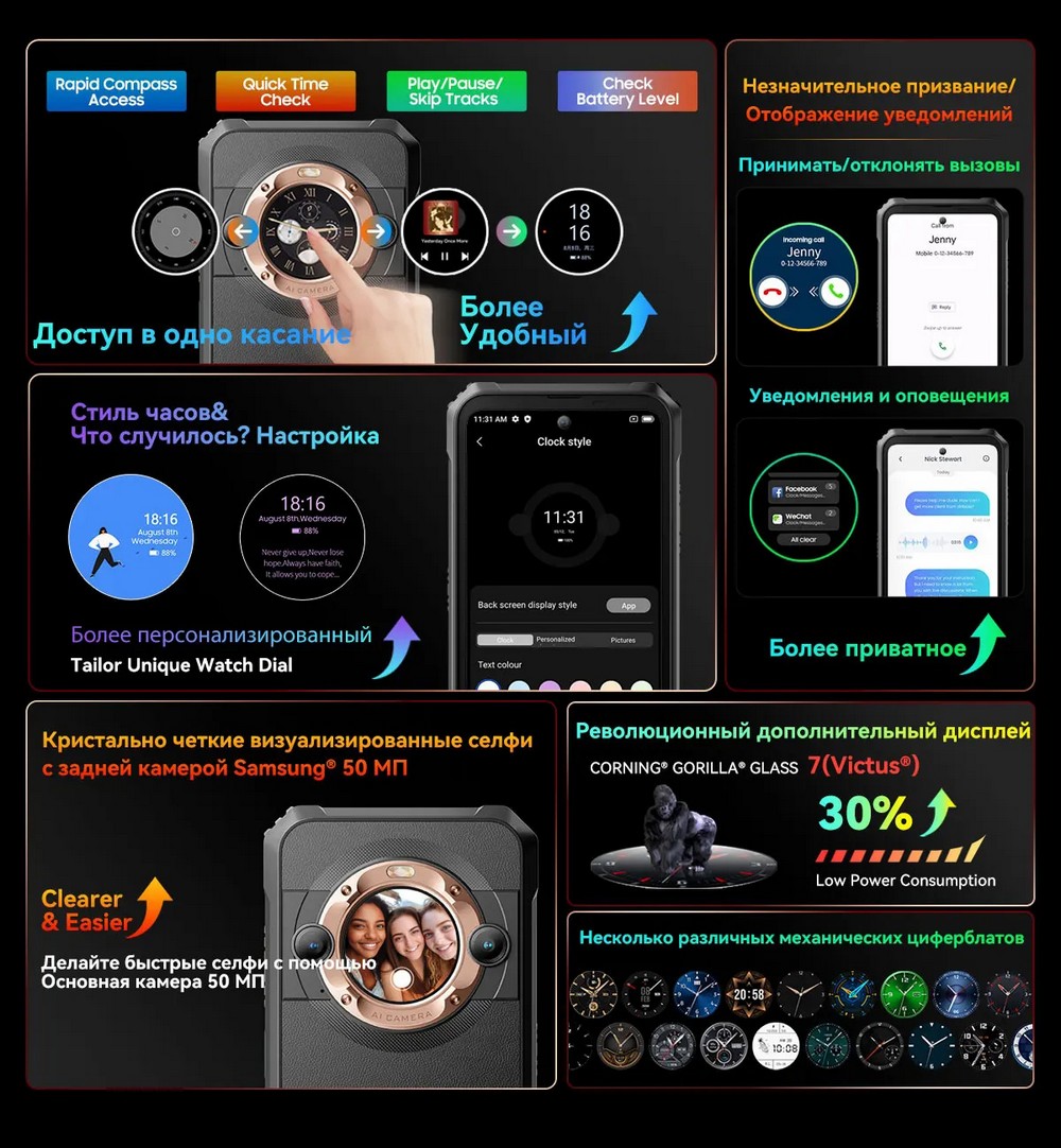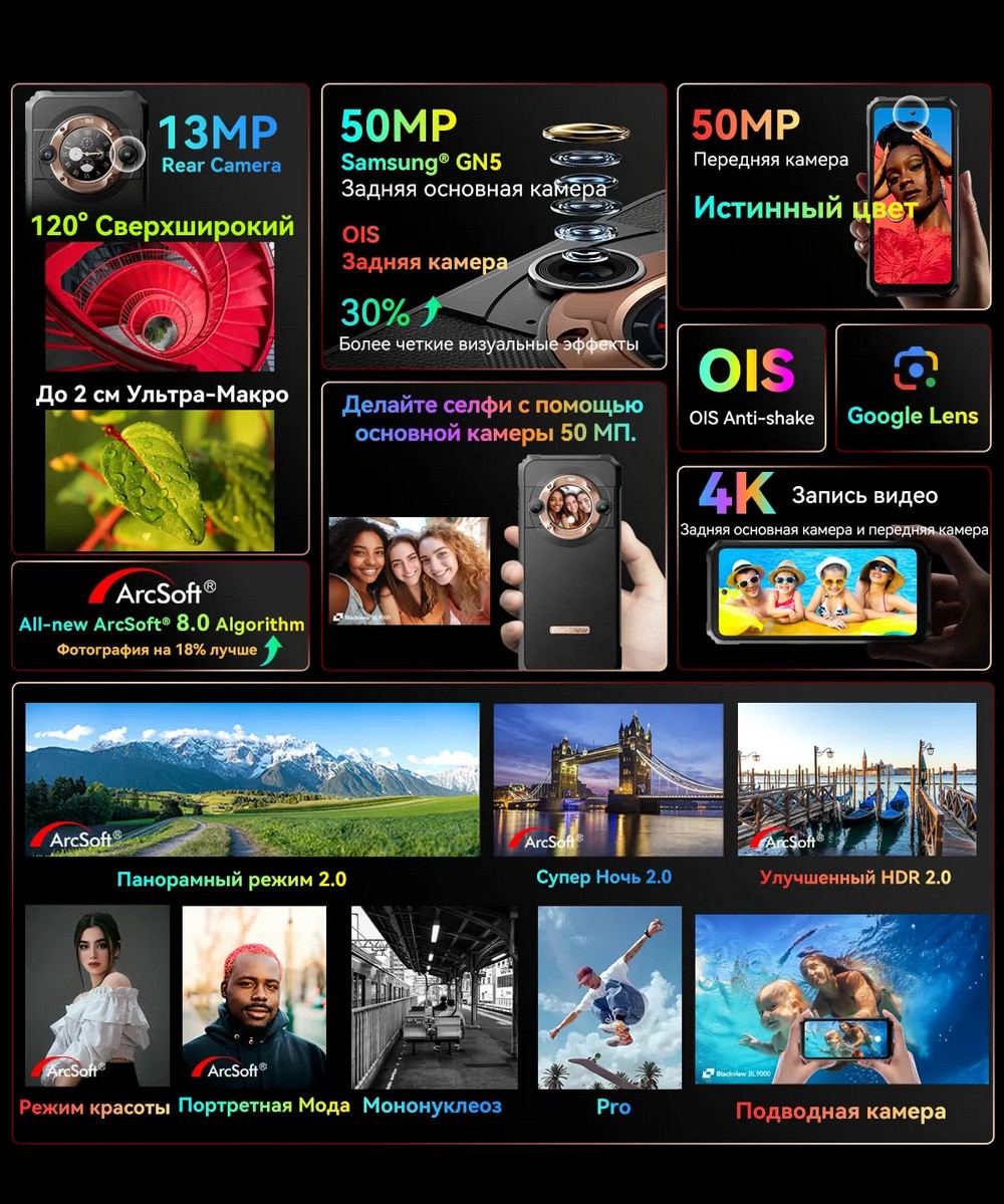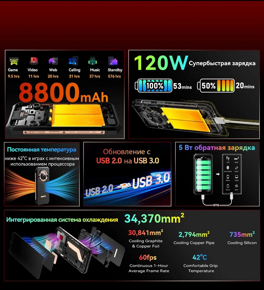 | Дополнительно | Мощный аккумулятор |