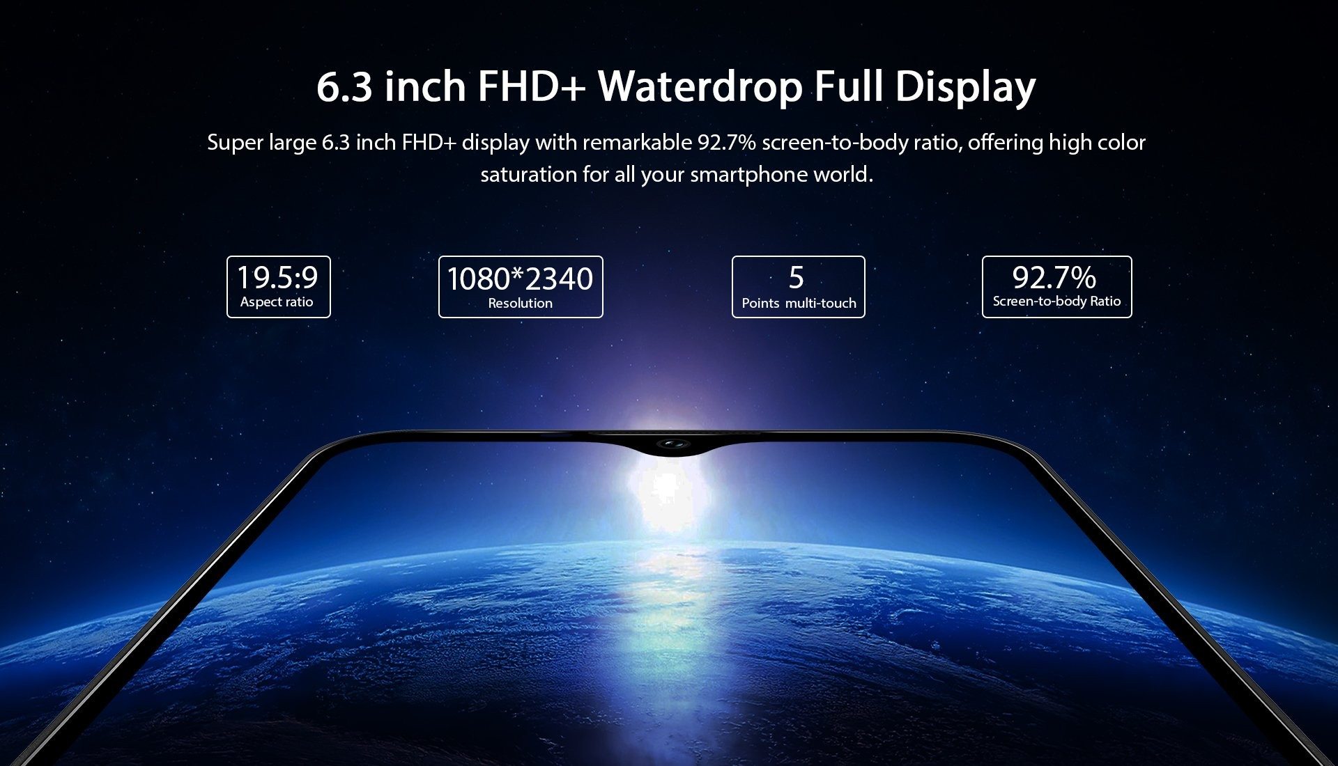 - 6.3 дюймовый IPS дисплей получил ультраширокий формат диагональю 19.5:9 и разрешением FHD+ 2340×1080.