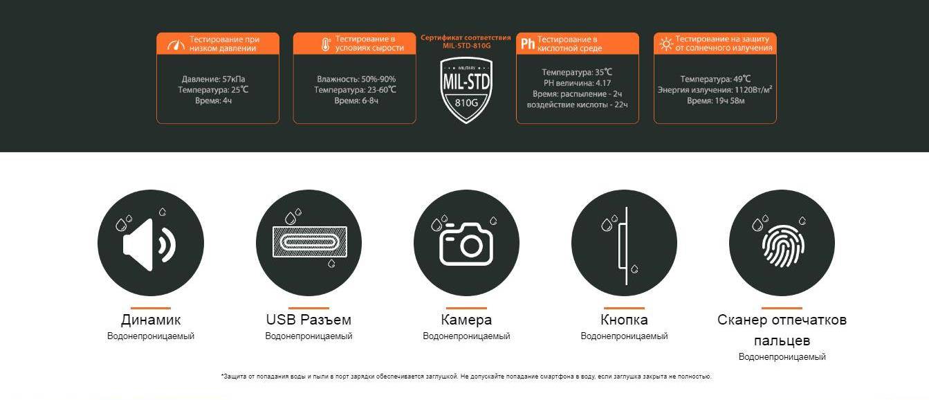 - Этот полностью водонепроницаемый смартфон к тому же имеет военный стандарт США MIL-STD-810G, подтверждающий его защиту от ударов. Противоударный корпус прорезинен, приятен на ощупь и не даст выскользнуть из мокрых рук. По всему периметру он защищен резиновыми накладками, гарантирующими сохранность аппарата при падениях на твердые поверхности. По бокам прикручены металлические накладки, там же находятся кнопки питания, регулировки громкости и вызова интернет-рации.
