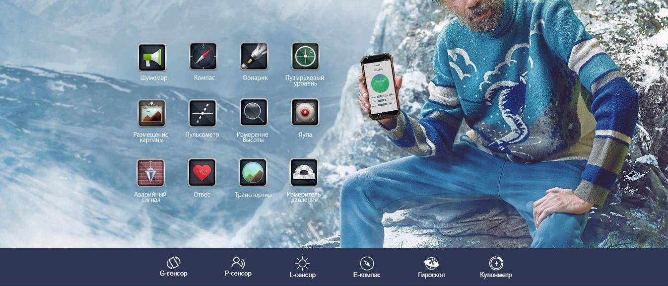- Набор специальных программ: шумомер, компас, фонарик, строительный уровень, отвес, настенный уровень, дальномер, увеличительное стекло, сигнал тревоги, измеритель сердечного ритма, барометр, транспортир.