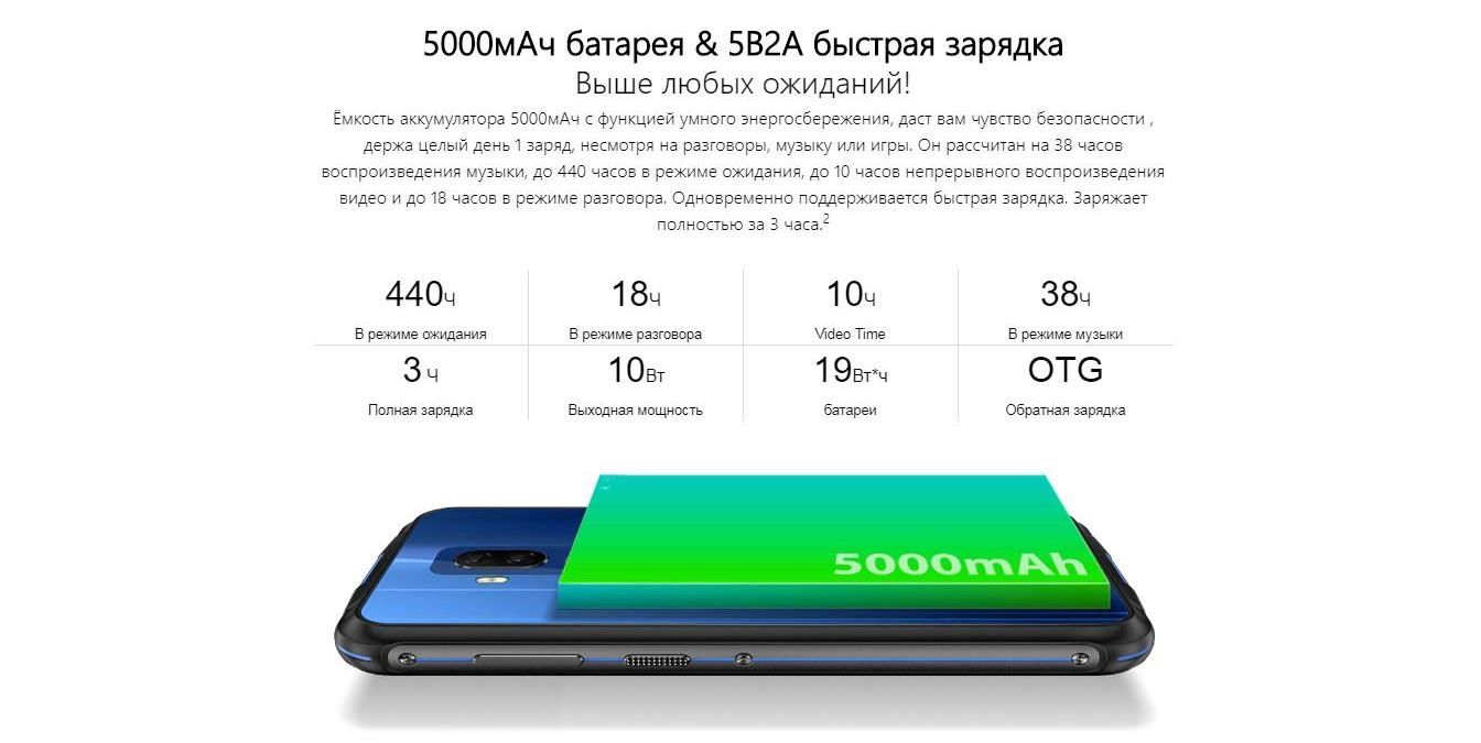 - Емкость аккумулятора 5000 мАч. Этого хватит на 440 часов в режиме ожидания, 18 часов разговоров или 38 часов прослушивания музыки.
