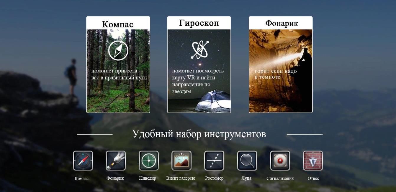 - Набор специальных программ: компас, фонарик, строительный уровень, отвес, установка картины, дальномер, увеличительное стекло, сигнал тревоги.