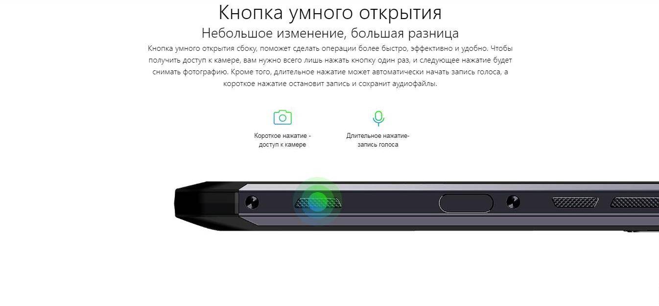 - Кнопка умного открытия сбоку, поможет сделать операции более быстро, эффективно и удобно. Чтобы получить доступ к камере, вам нужно всего лишь нажать кнопку один раз, и следующее нажатие будет снимать фотографию.