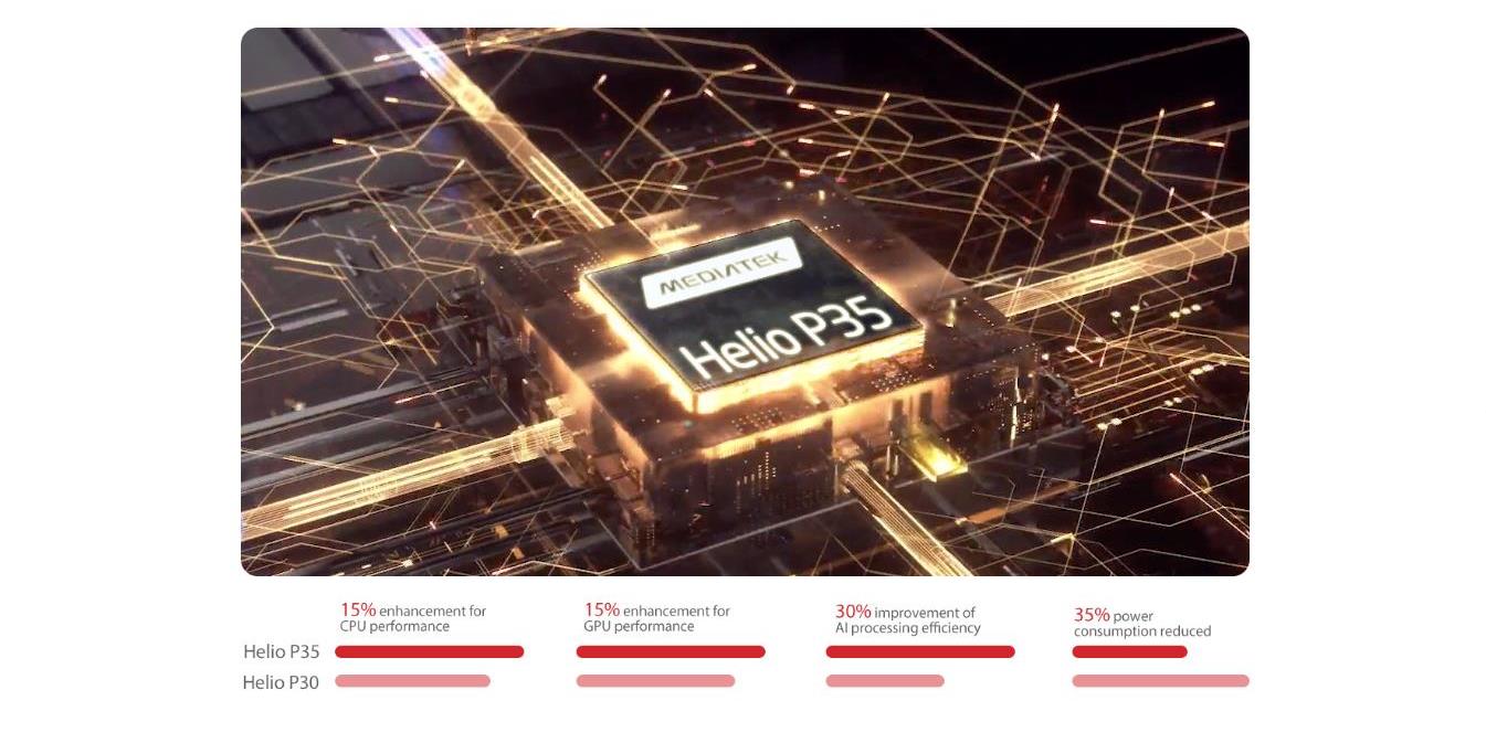- Внутри смартфона трудится чипсет Helio P35, у которого в подчинении находятся 8 ядер с максимальной частотой 2.3 ГГц.